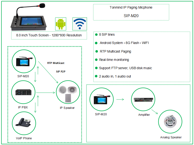 Tonmind IP Paging Microphone SIP-M20 is designed with elegant cast aluminum panel and cold rolled sheet shell. It converts the input analog audio signal into IP audio stream output, thus can realize remote control and management of terminal equipment. The IP network paging station has built-in Android system, up to 8G flash storage. 8 SIP lines enable free phone calls. WiFi enables more network mode capability. Built-in 5W speaker and microphone enable easy communication, announcement receiving and monitoring. User-friendly UI enables easy contacts control. The IP Microphone supports RTP multicast paging, point to point and zone paging. It’s ok to download and upload files via FTP sever and USB disk. There are two audio in, one audio out to provide multi paging solutions. It supports real-time monitoring and speaking while playing music, which can be widely used in VoIP, security and public address system fields.