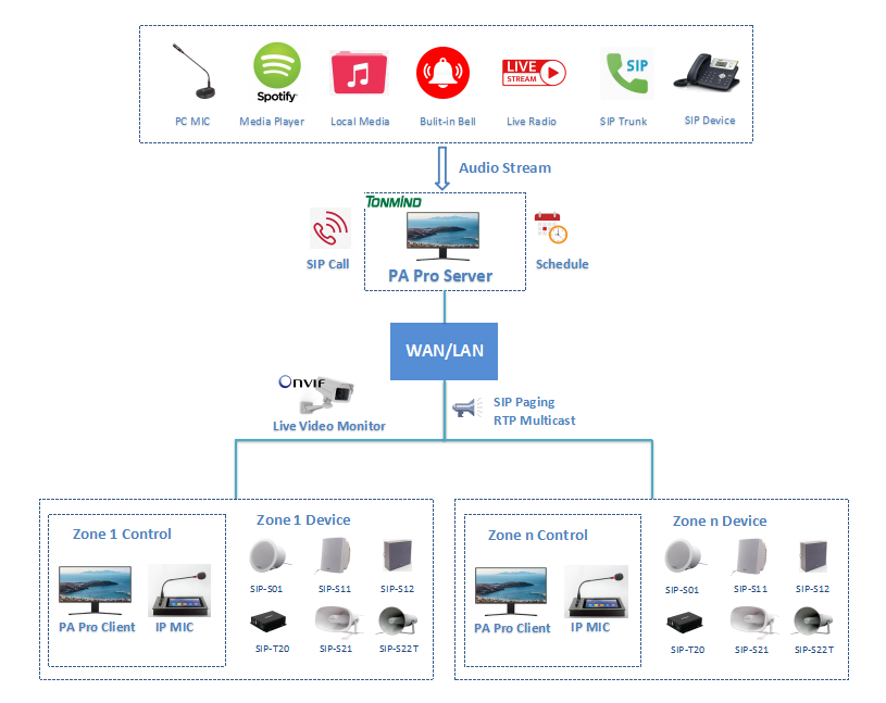 Tonmind PA System Pro 2.0 is an audio broadcast software with built-in SIP server. It has server & client end thus supports multi-user control. It enable maximum 1000 zones in the system, each zones are flexible to arrange Tonmid IP speakers, IP door phone and any SIP devices to group paging. It creatively add ONVIF CCTV combining with ONVIF speaker, which make it perfectly to apply to security projects and more application scenarios. In the session, it can realize meeting function for each connected SIP extension. It provides all-in-one unified IP audio solution. It can support SIP extension broadcast. It can play various audio sources from SIP call, live radio, local media player, universal windows media player (for example, Spotify, iTunes, VLC, etc. ), also support TTS: text to speech. It’s perfect to be used in School PA System, Commercial PA System, Transportation PA System, Hotel PA System, Health Care PA System, etc.