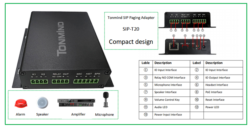 SIP-T20, 48K OPUS Audio Codec, MIC, headset and speaker interface. Alarm: GPIO, HTTP URL and relay out. Compatible with VoIP SIP devices, ONVIF VMS.