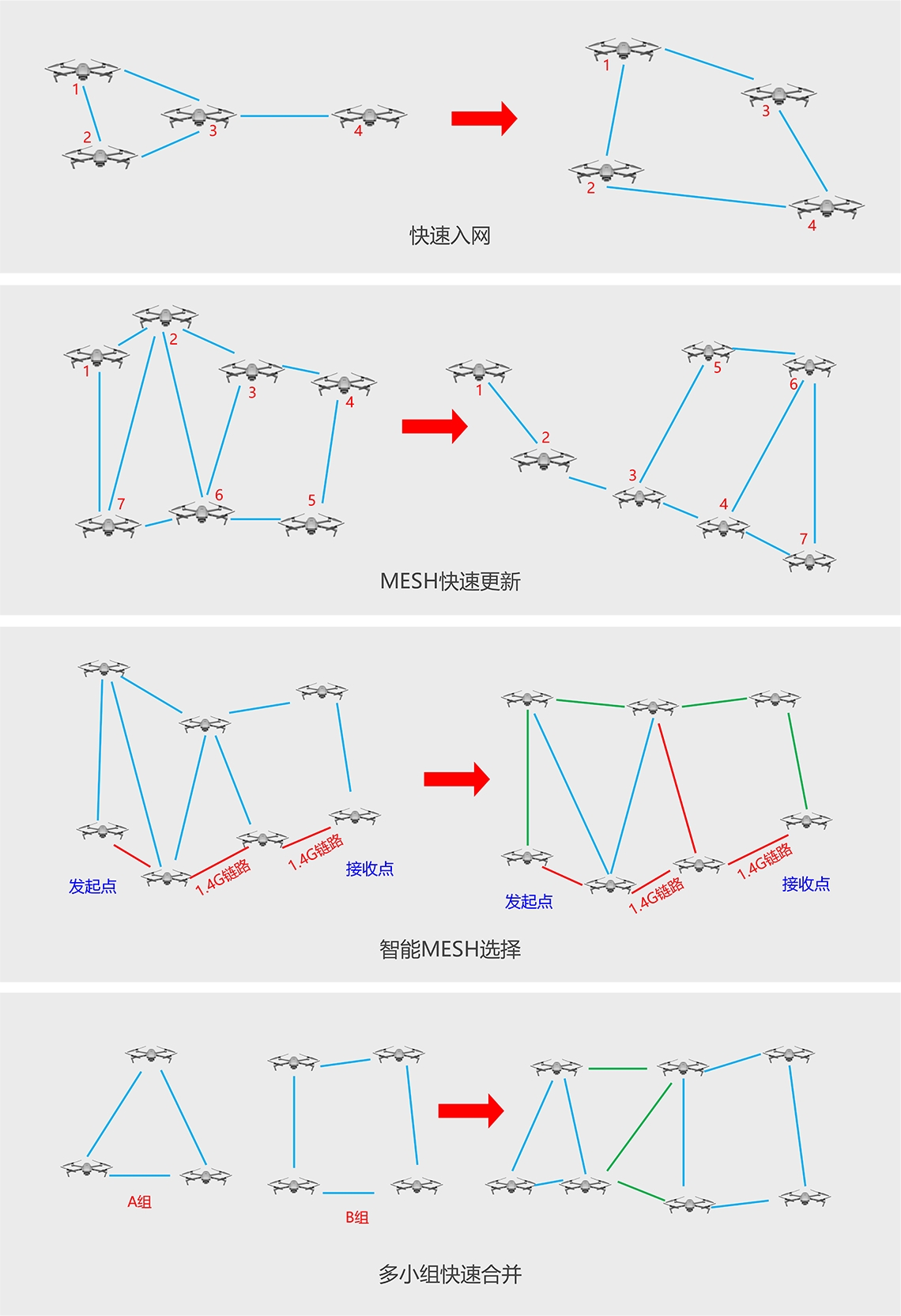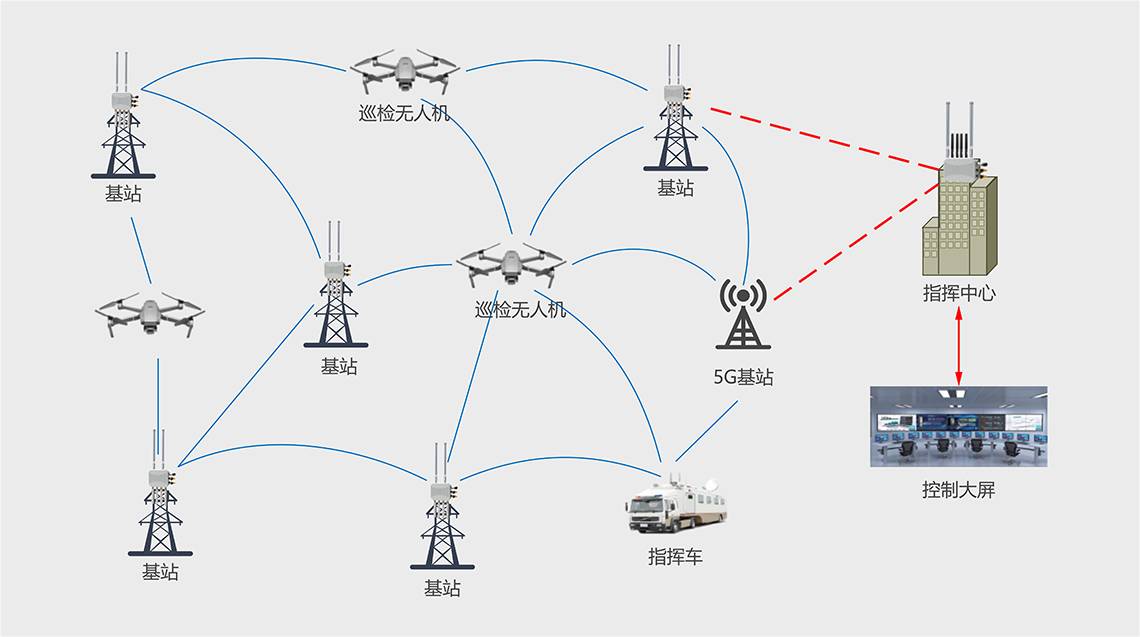 In practice, drones can move freely within the signal coverage area, and on-site audio and video footage can be transmitted back to the command center in real time via the self-organizing network link. On-site emergency maintenance vehicles can also serve as temporary command posts and interconnect with the command center. (The wireless network channel protocol is standard TCP/IP. Customers requiring specialized data transmission functions can simply comply with the above protocol.)
