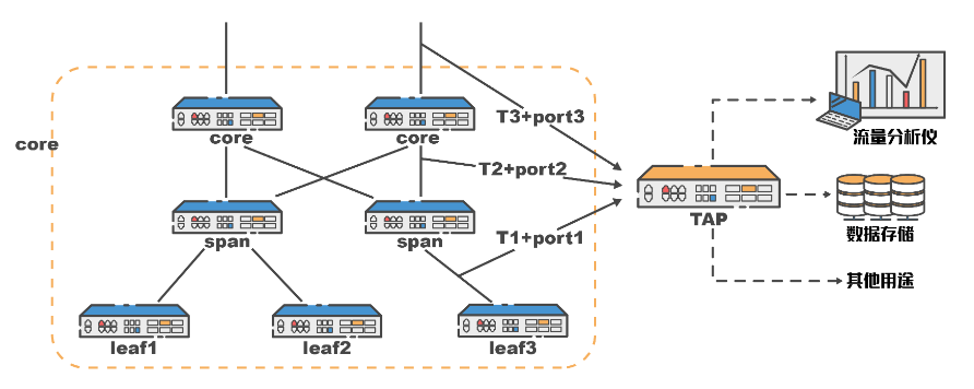 As shown in figure above, user can enable the timestamp and source port label function of TAP devices, the server cluster can access the exact packet process time in each layer via source port and timestamp message carried by the packets. From port1, port2, port3, user can distinguish the devices that the streams come from. Through T1, T2 and T3, packets forward latency of each device can be calculated, according to that, user can find out the bottleneck during packet forwarding for the further optimization of network.