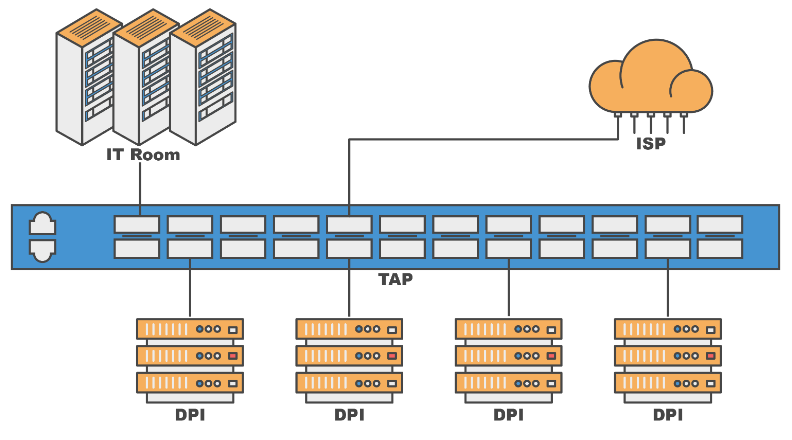 Generally, TAP devices can be used to assist DPI (Deep Packet Inspection) in networks. TAP is applied to forward flows to intranet and sends a mirrored copy of the packet flow to DPI device at the same time. The DPI device is for traffic analysis, once a virus on website or illegal information has been monitored, the flows will be blocked by a five elements table sent from management channel between DPI and TAP.